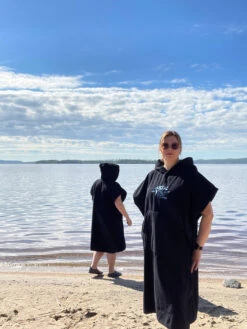 Mustasta nopeasti kuivuvasta mikrokuituisesta materiaalista valmistettu paksu uimaponcho.