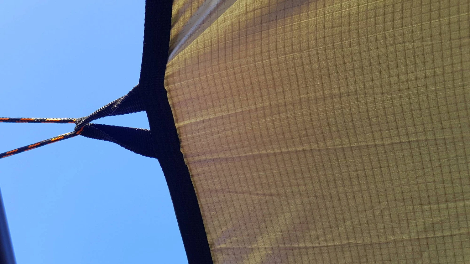 Tarpin poikki kulkee kaksi vahvikenauhaa n. 145 cm päässä reunoista, näkyy kuvassa joka on otettu ilmasta käsin.