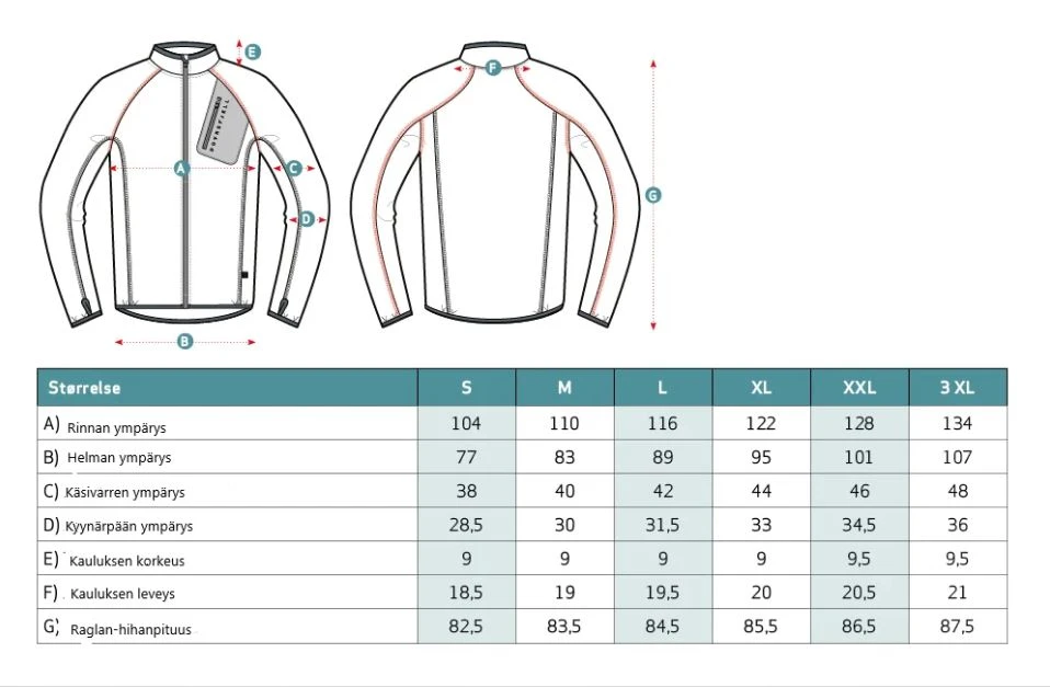 Takissa on vetoketjullinen rintatasku ja peukalonreiät hihansuissa.