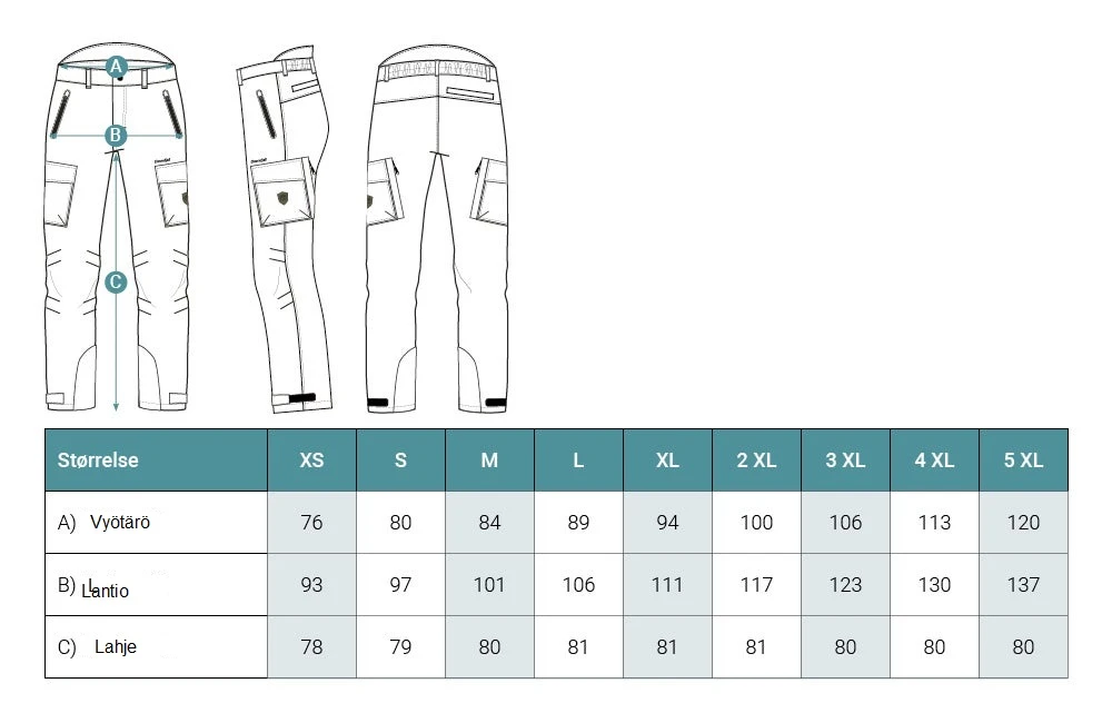 - Housuissa on kaksi sivutaskua, kaksi reisitaskua ja takatasku- Kaikissa vetoketju.