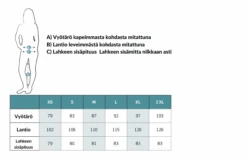 Normaalit vyölenkit max 60mm leveälle vyölle. Housut venyvät vyötäröltä elastisen kuminauhan avulla sopiviksi sekä kiristyvät Velcrosulkimen avulla. Vyötäröllä napit nappihenkseleiden käyttöä varten.
