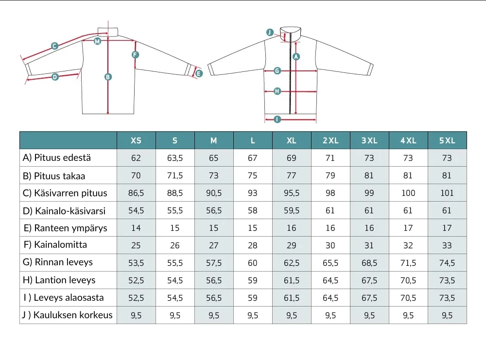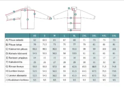 Näiden sulkeminen onnistuu vedenpitävillä vetoketjuilla. Puvun olkapäillä on lenkki antennin läpivientiin. Takissa on kaksi vetoketjullista taskua sekä tilava vetoketjullinen sisätasku.
