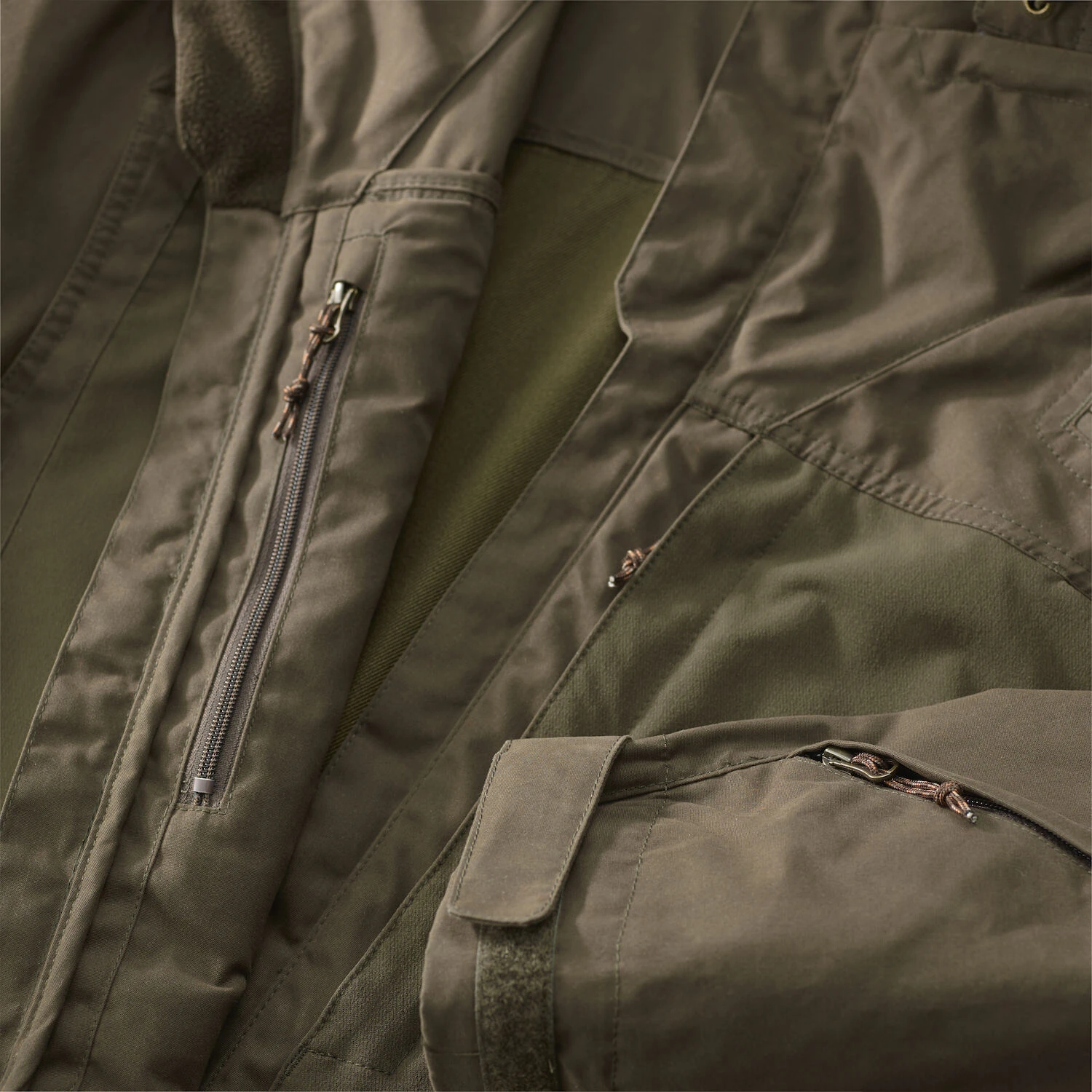 Selkä, hihojen yläosat ja taskut ovat stretch-kangasta. Näin saadaan hiljainen, kevyt ja hyvin joustava takki, joka hengittää erittäin hyvin.
