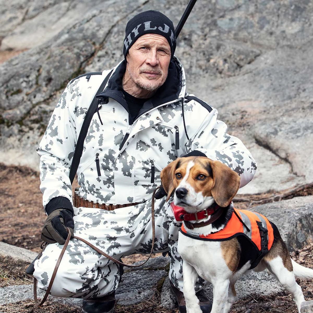 HYLJE Snow Camo M05 on suunniteltu ja mitoitettu pohjoismaiselle vartalotyypille sopivaksi. Väljän mallin alle mahtuu mukavasti lämpimiä vaatekerroksia, mikä laajentaa haalarin käyttöaikaa pikkupakkasilta viileämmillekin keleille. Isot taskut on suunniteltu niin, että niihin mahtuu kaikki tarvittava ja rintataskuun mainiosti myös koiran GPS-paikantimen vastaanotin. Liukuesteet hartioilla pitävät aseen ja repun hihnat paikoillaan ja vyötärön D-lenkkeihin saa ripustettua tarpeellisia tavaroita nopeasti käden ulottuville. HYLJE Snow Camo M05:ssä on laadukkaat Opti-vetoketjut, joiden pitkiä vetimiä on helppo käyttää myös käsineet kädessä.