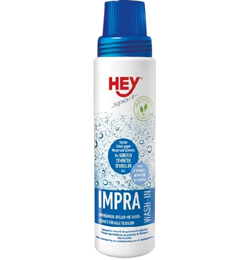 Hey Sport Impra Wash-In on kalvoasujen huuhteluaine, joka säilyttää ja antaa takaisin pintamateriaalille sen vettä hylkivän ominaisuuden.