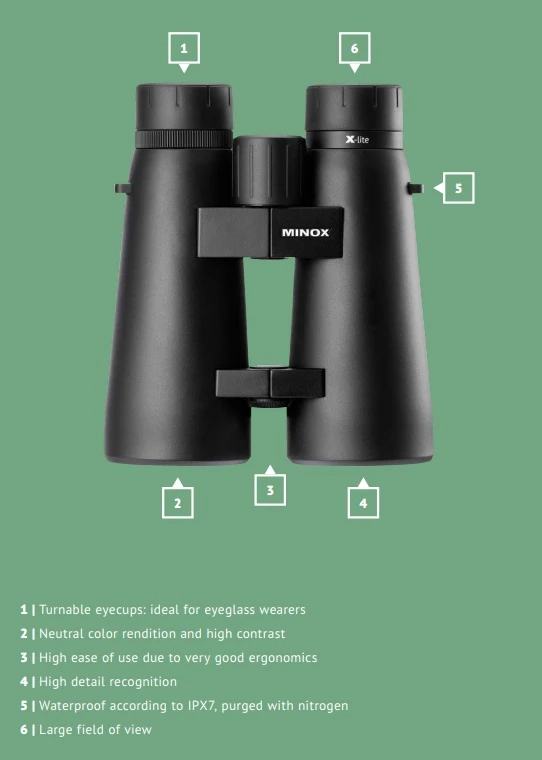 MINOX X-lite katselukiikarien neutraali värintoisto ja korkea kontrasti tarjoavat erittäin hyvän kuvankäsittelyn. Vankan rakenteen ansiosta X-lite-sarja on myös hyvin suojattu ulkopuolista kulutuskäyttöä vastaan.