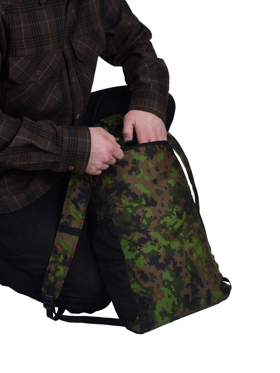 Reppu pakkautuu itseensĂ€; pieneen noin 18Ă18 cm vetoketjulliseen pussiin.