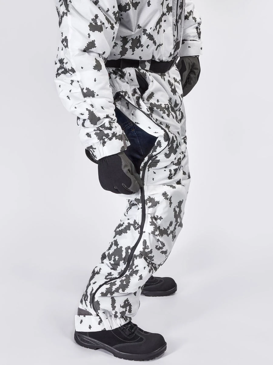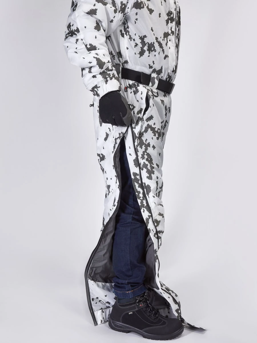 Kaksilukkoiset kylkiketjut avautuvat myös yläpäästä, joka mahdollistaa pääsyn alla olevien housujen taskuille. Haalarin alaosan edessä on tilavat housutaskut hansikkaille ja käsien lämmittelyä varten.