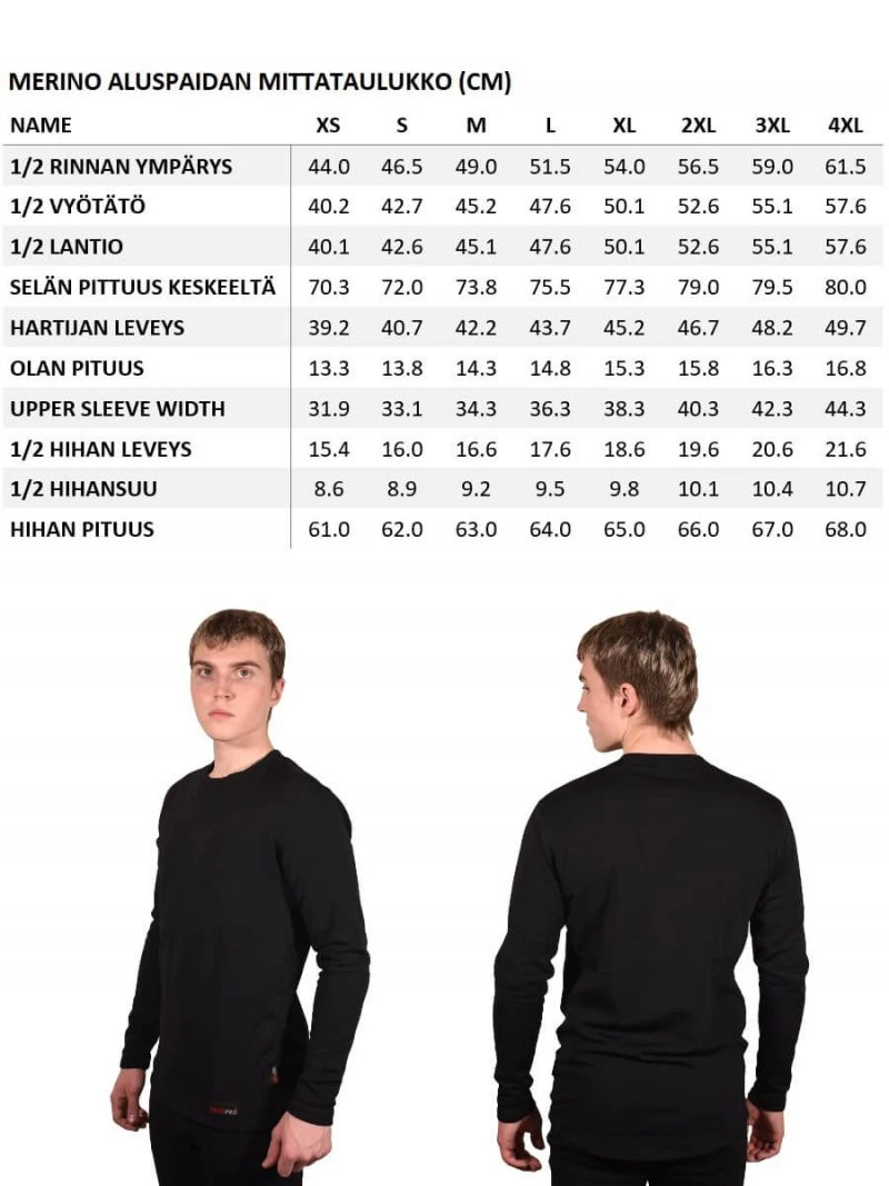 Alusasu on mitoitettu suomalaiselle käyttäjälle. Paidan helmat ovat riittävän pitkät ja housun lahkeissa ja hihoissa on riittävästi löysää. Housujen vyötärö on korkea ja alaselkää suojaava.