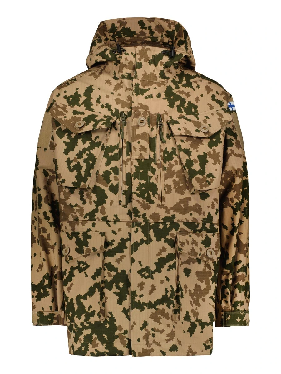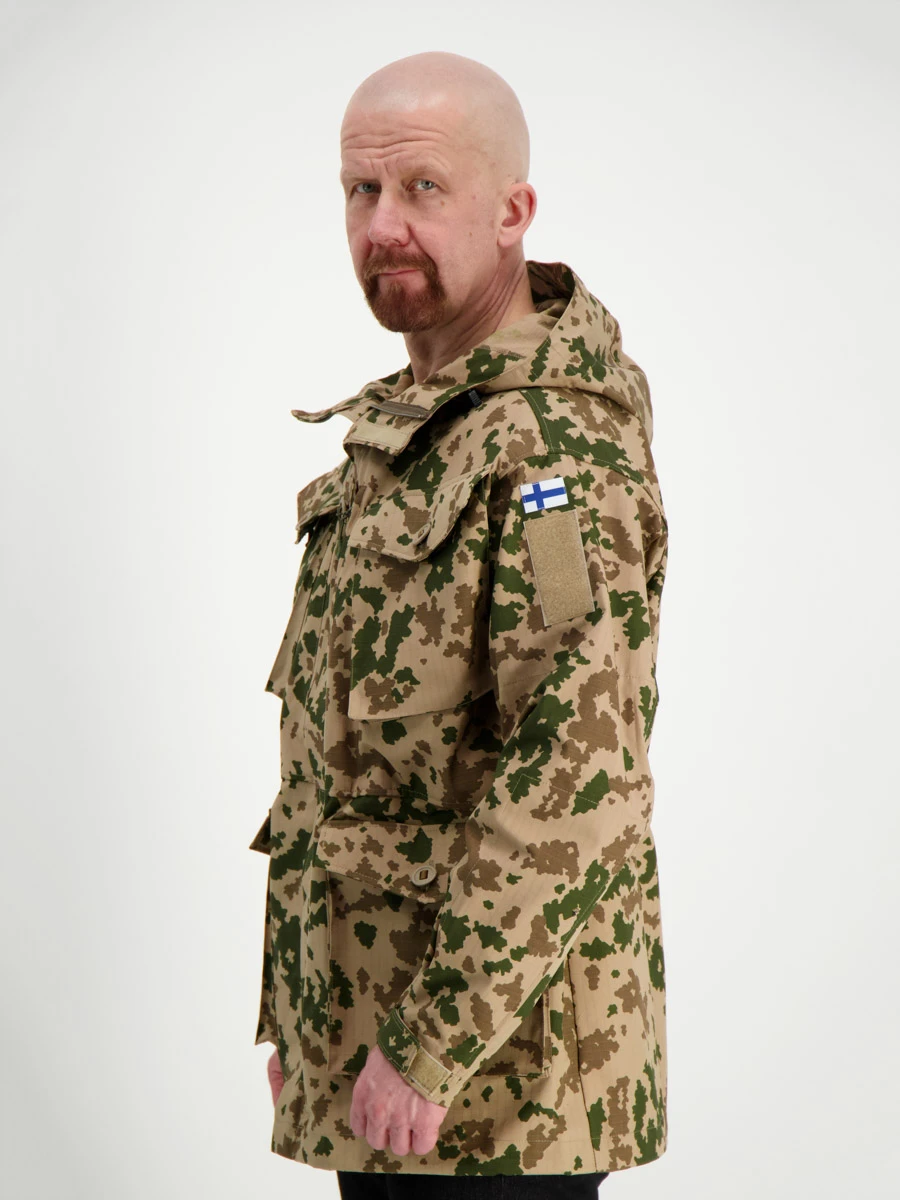 Olkapäässä on discreetin kokoinen Suomen lippu. Värit täyttävät visuaaliset ja puolustusvoimien IR-heijastusarvot.