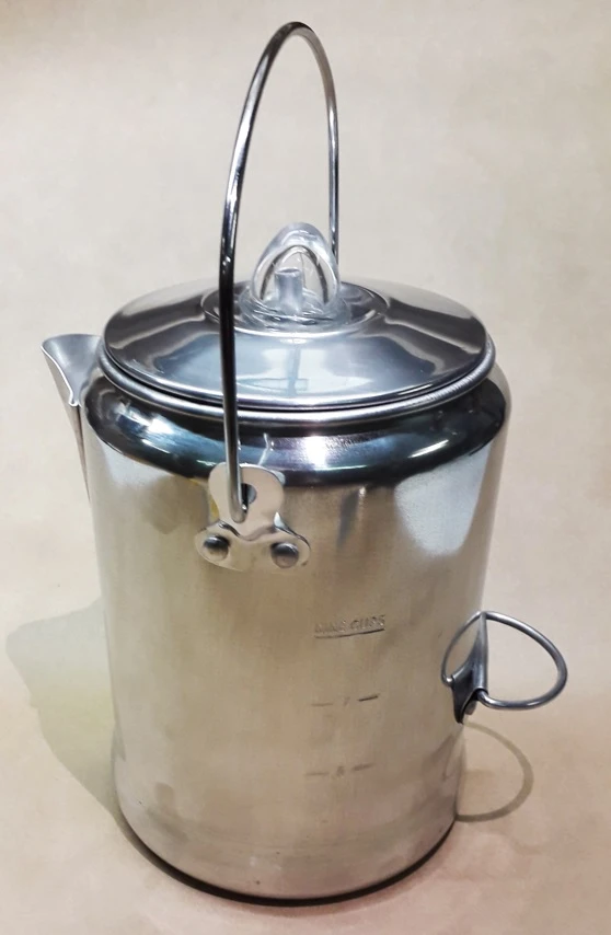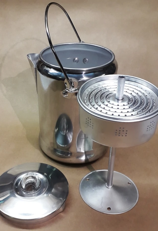 Perkolaattori on valmistettu alumiinista ja sitä voi kuumentaa nuotiolla, liedellä tai muulla tasaisesti lämpöä tuottavalla lämmön lähteellä.