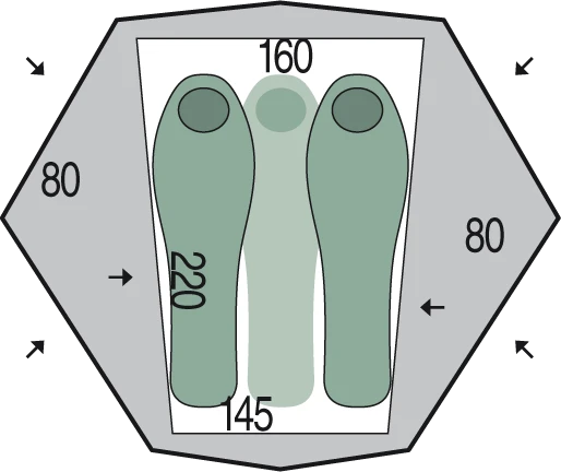 Tilava kolmen hengen kupoliteltta kahdella sisäänkäynnillä.