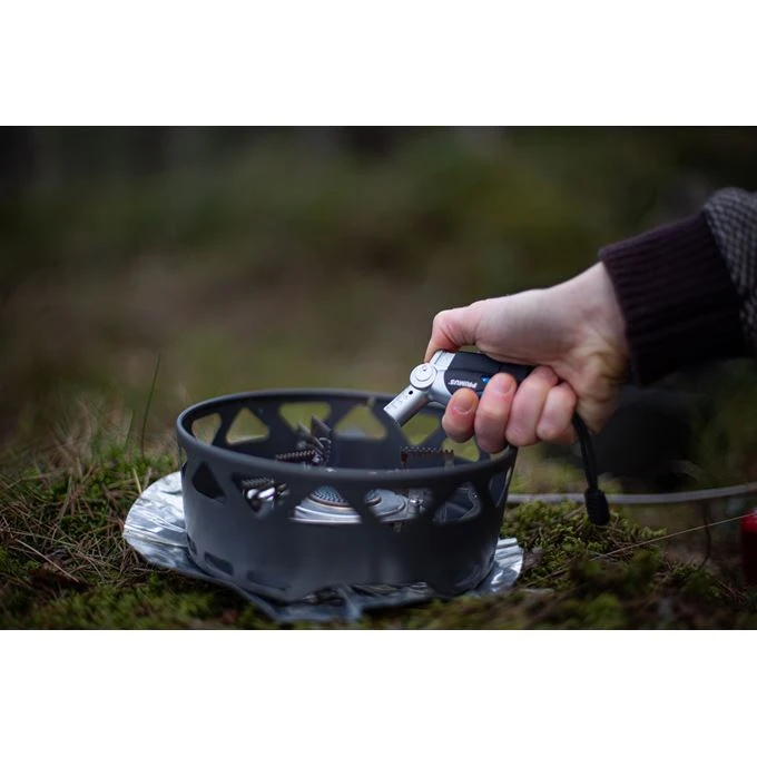 Sytytin myydään ilman kaasua, mutta se on helppo täyttää esimerkiksi Primus Allroundgas-butaanikaasulla.
