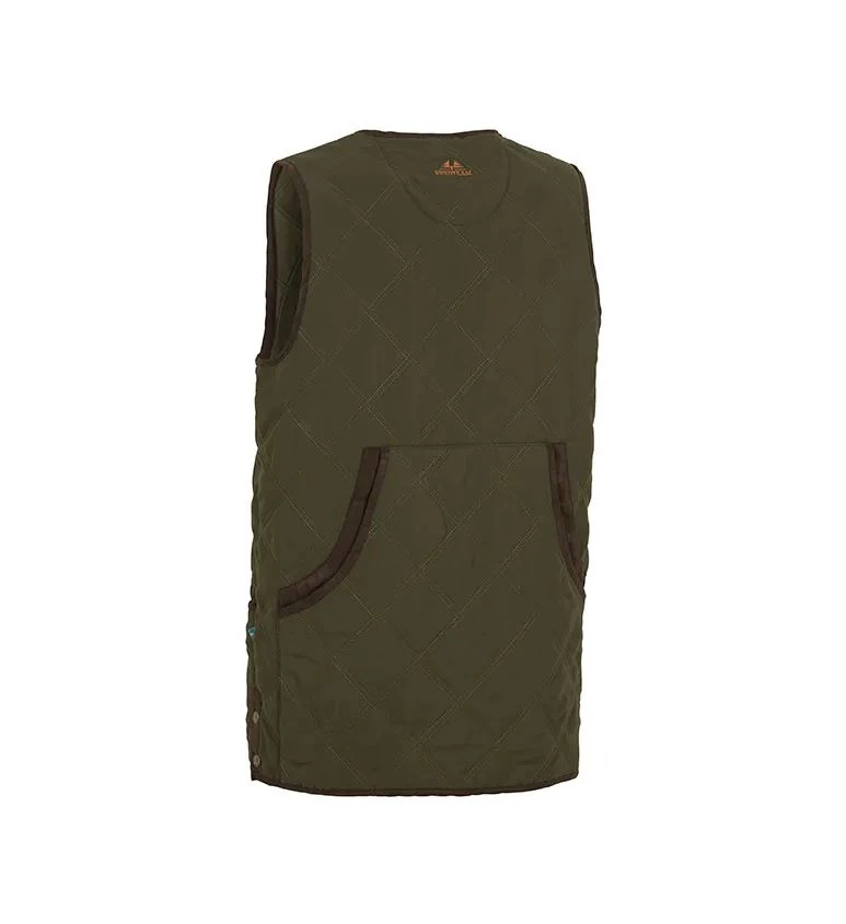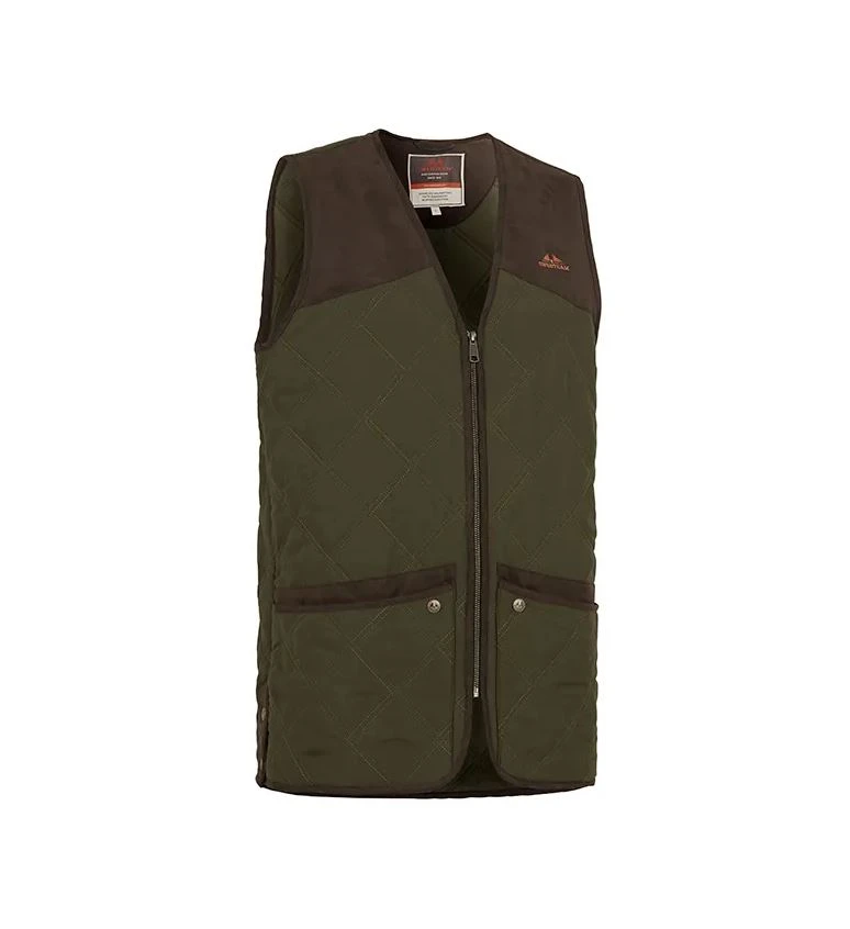 Klassinen tikattu metsästysliivi. Mokkanahkaiset vahvistukset olkapäissä. Tilavat etutaskut ja iso takatasku.