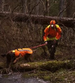 Kaikki yksityiskohdat, toiminnaliset ratkaisut ja materiaalit ovat mietitty silmällä pitäen koiranohjaajaa. Huomiovärinen joustavasta materiaalista valmistettu hybridi-anorakki, jossa epäsymmetrinen vetoketju vasemmalla puolella.