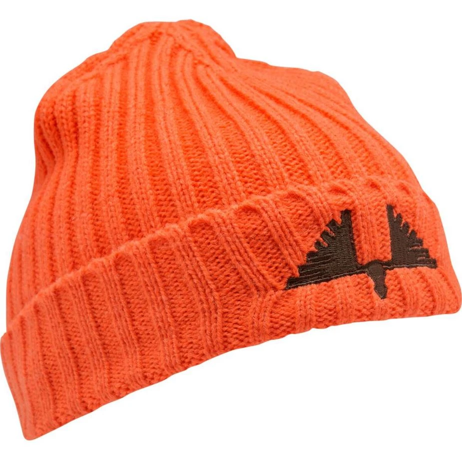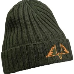 Valkoinen klassinen neulottu pipo. Edessä brodeerattu Swedteam-sarvilogo.